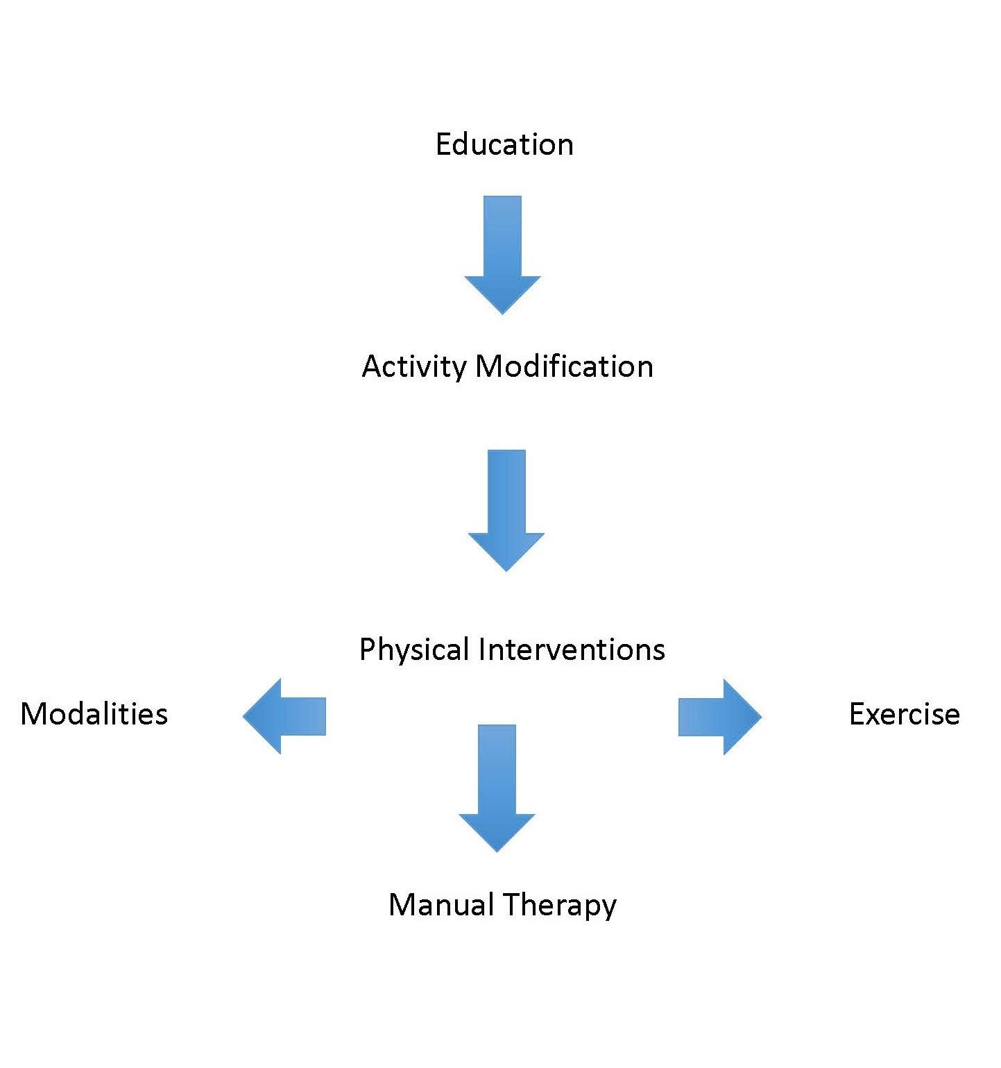 Finally, physical interventions. Every intervention physical therapy has to offer fits into one of three categories – manual therapy, exercise, or modalities. Many interventions may cross categories – for example, is dry needling manual therapy or a modality? What about kinesiotape? At any rate, what ever you can think of in terms of intervention…mobilization, manipulation, muscle energy, strain-counter-strain, ASTYM, Graston, taping, stabilization, Pilates…all have at least one home. Remember, everything works some of the time…and there’s much more out there than just manual therapy. In general, we know that manual therapy and exercise work well together. Increasingly, evidence supports a neurophysiological mechanism for manual therapy, so it is beneficial to offer corrective exercise immediately after any manual therapy technique to ensure new movement patterns are consolidated. Then PT avoids the passive reapplication of techniques over a long period of time. As a general rule, there is little evidentiary support for modalities, but anyone who has been in clinical practice for a while knows that they have their place.