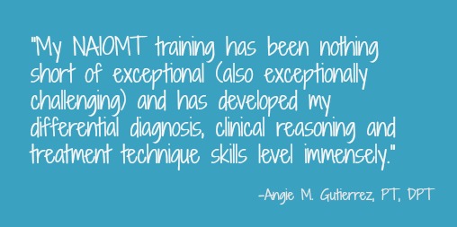What Do NAIOMT Programs & CE Courses Provide a PT? Ask Angie M. Gutierrez, PT, DPT June 23, 2015June 20, 2015 Posted in clinical skills, Courses, Manual TherapyFormat Post format: Image Share this: Click to share on LinkedIn (Opens in new window) LinkedIn Click to share on Facebook (Opens in new window) Facebook Click to share on X (Opens in new window) X More Click to email a link to a friend (Opens in new window) Email Click to print (Opens in new window) Print Like Loading... Related Published by NAIOMT The North American Institute of Orthopaedic Manual Therapy (NAIOMT) provides continuing ed, OMT certification, and residency and fellowship programs to physical therapists. View all posts by NAIOMT