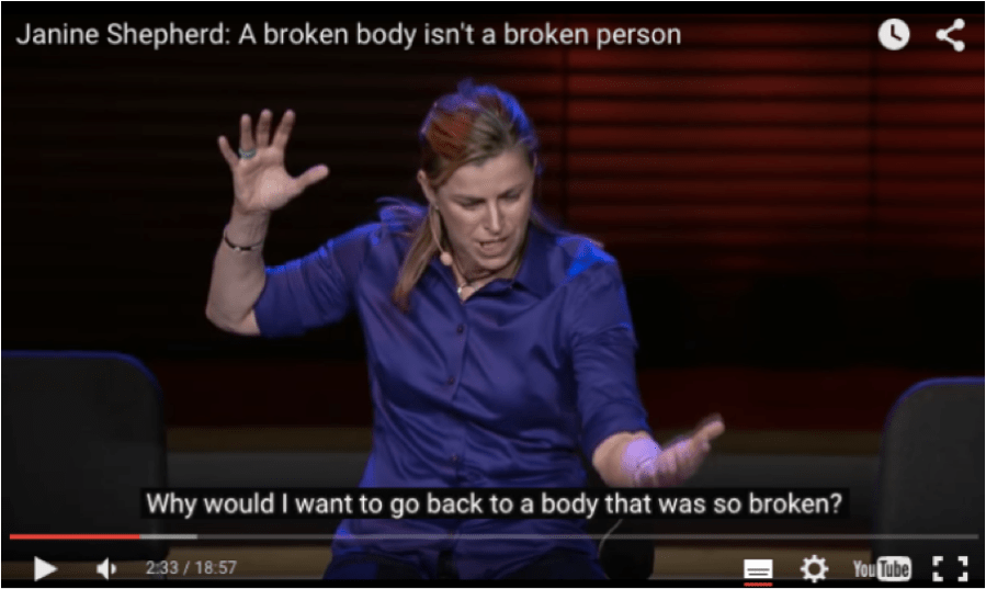 Recovery is a journey. In the Ted Talk below, champion cross country skier Janine Shepherd shares her story of resilience after a horrific accident, and offers wise words for those who face a trying road to recovery. “A broken body isn’t a broken person” she discovers, and it was in fact little goals that kept her “going all the way.”